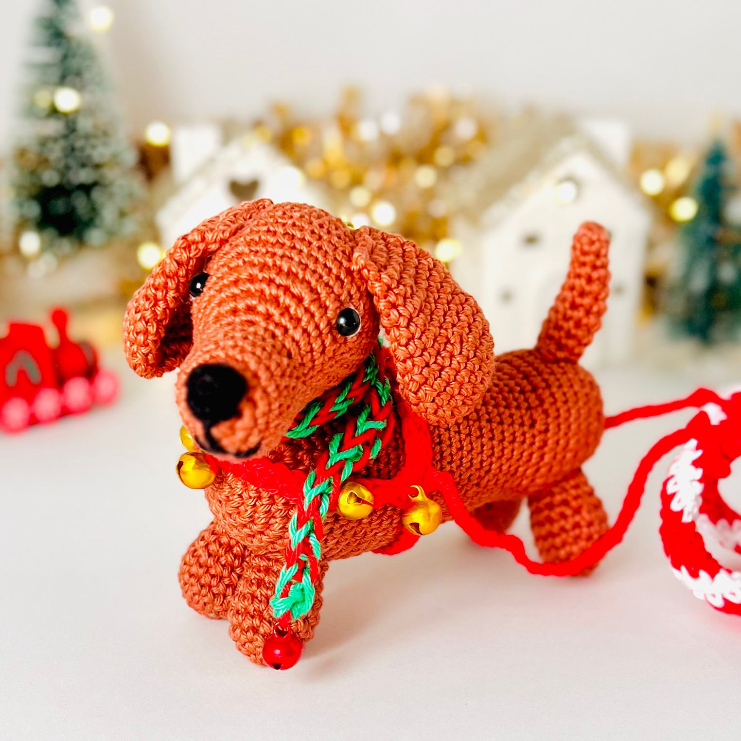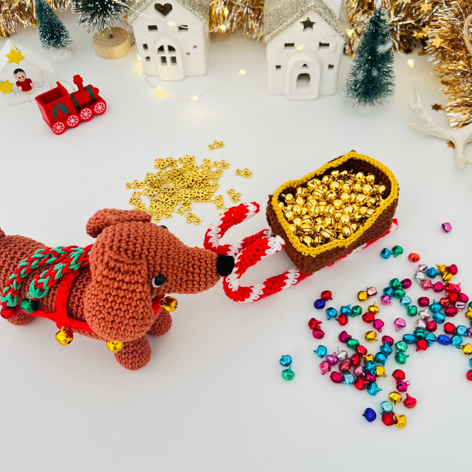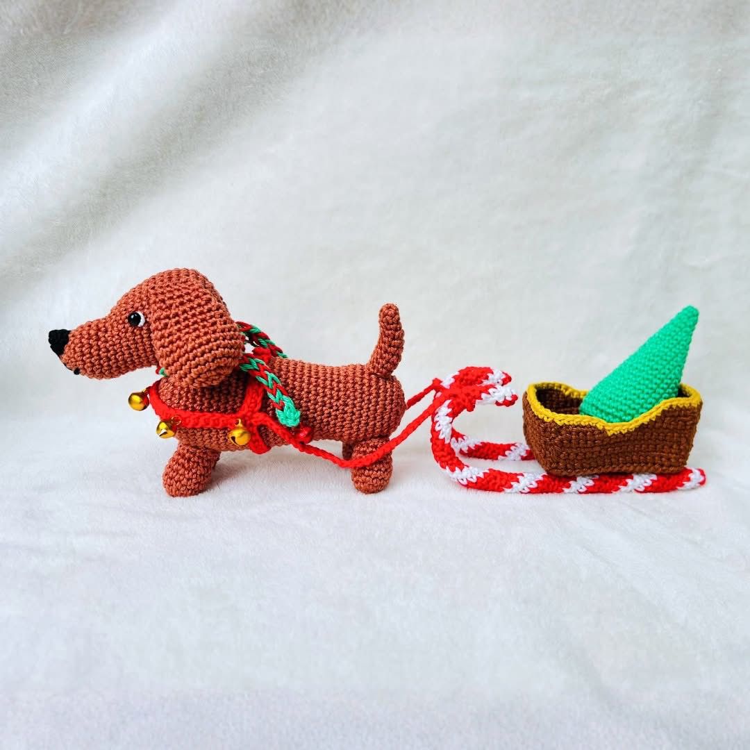 Inhoud: Alle garen om Tippy de Teckel, slee en kerstboom te haken, veiligheidsoogjes en belletjes.